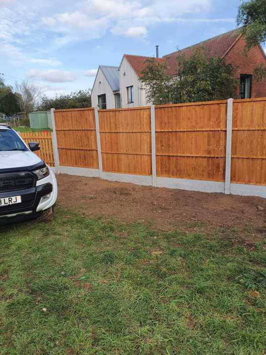 28 bays of arched top feather edge panels and plain face gravel boards.