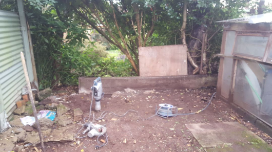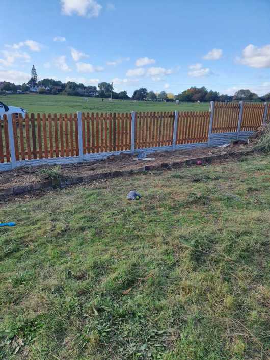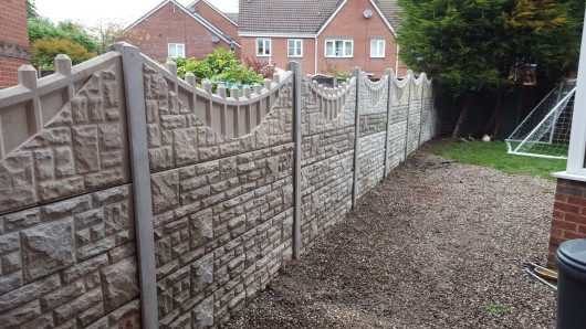 Existing fencing removed and replaced with, concrete rockface gravel boards, consisting of four, one ft high boards, placed upon each other, finished with a bespoke castle top 2ft high gravel board and secured insitu with concrete smooth finish posts.